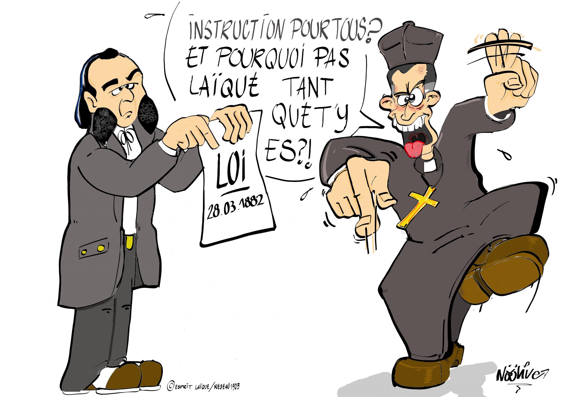 Maintenant qu'on a coupé le bras de l'église sur le créneau de l'instruction, faut assumer. La République décide que plus jamais, il n'y aura de retour en arrière…point barre. 1881- 1882. C'est pas hier ! On est donc passé de l'éducation par des curés, à l'instruction par la République. Côté curé, on était pas d’accord ... Un gros morceau venait de leur filer entre les pattes. Plus de chair à canon idéologique à disposition, il fallait regagner des points ailleurs. Ailleurs où ? À l'église, au catéchisme en étant plus virulent, vicieux etc. etc. et en saoulant les députés et les sénateurs, les maires…bref en faisant de la politique.